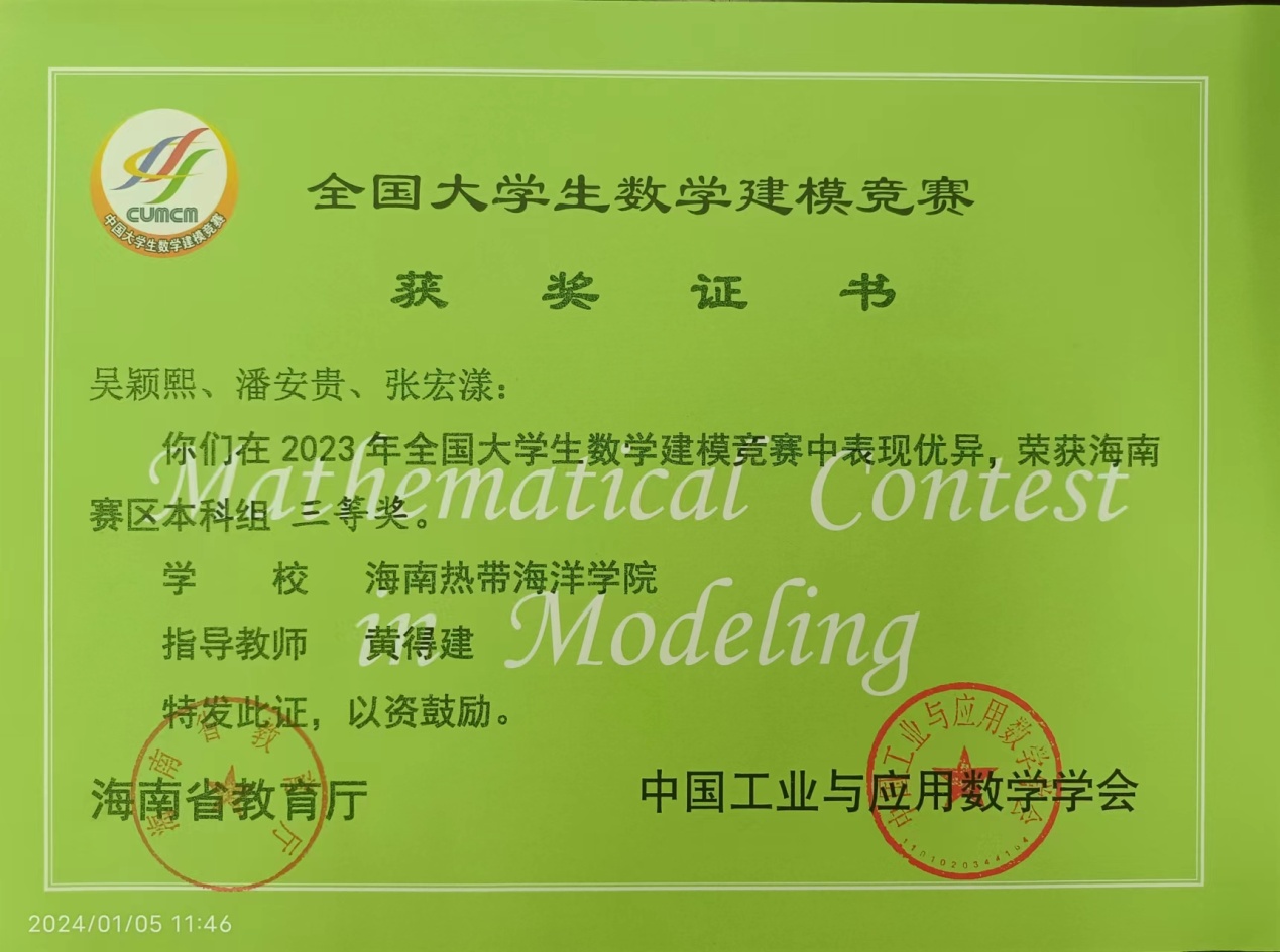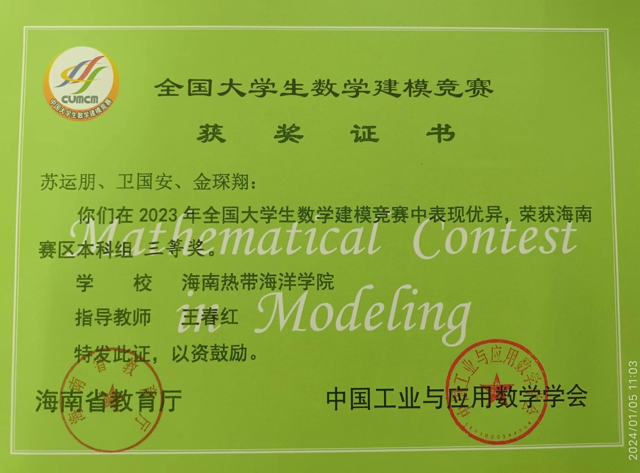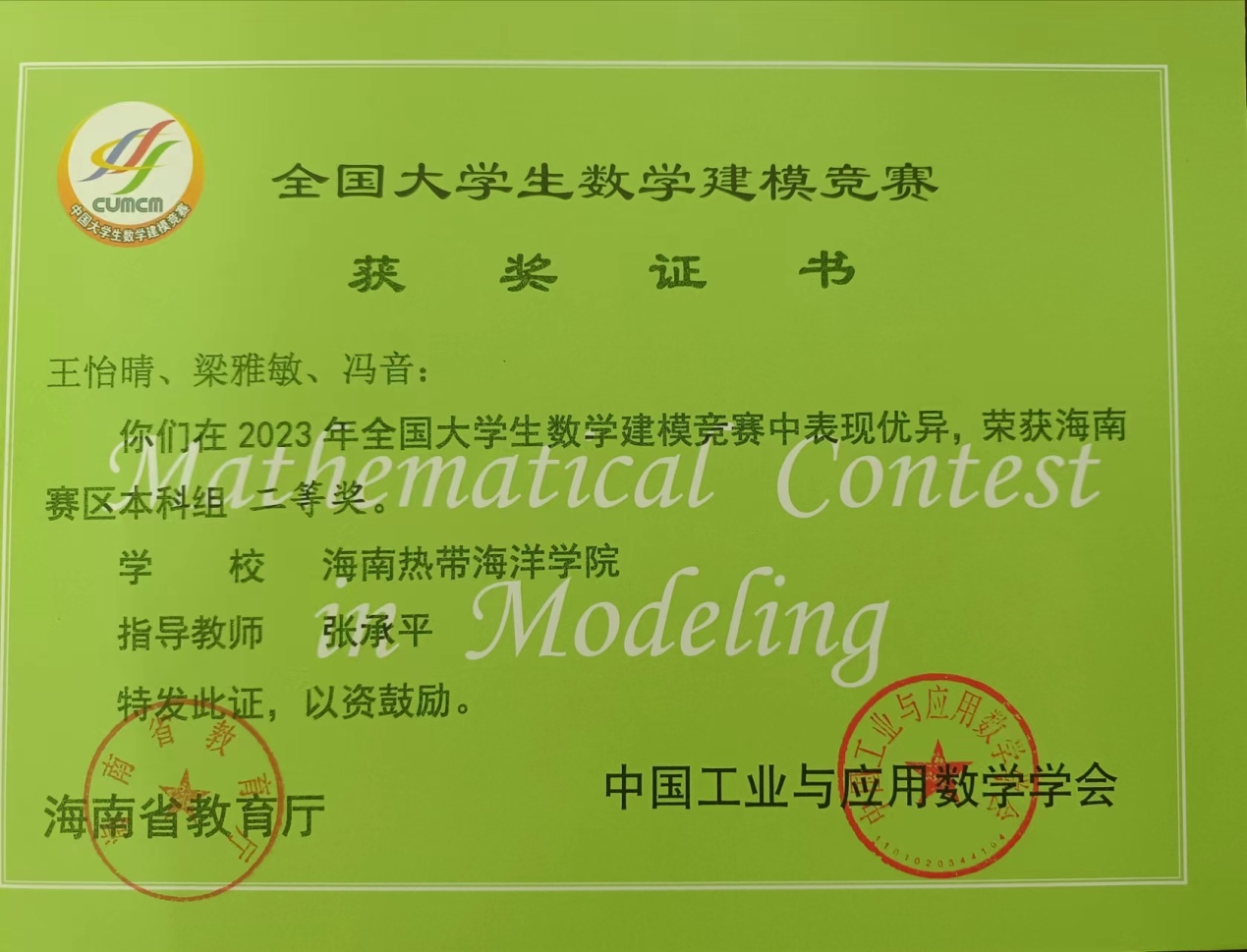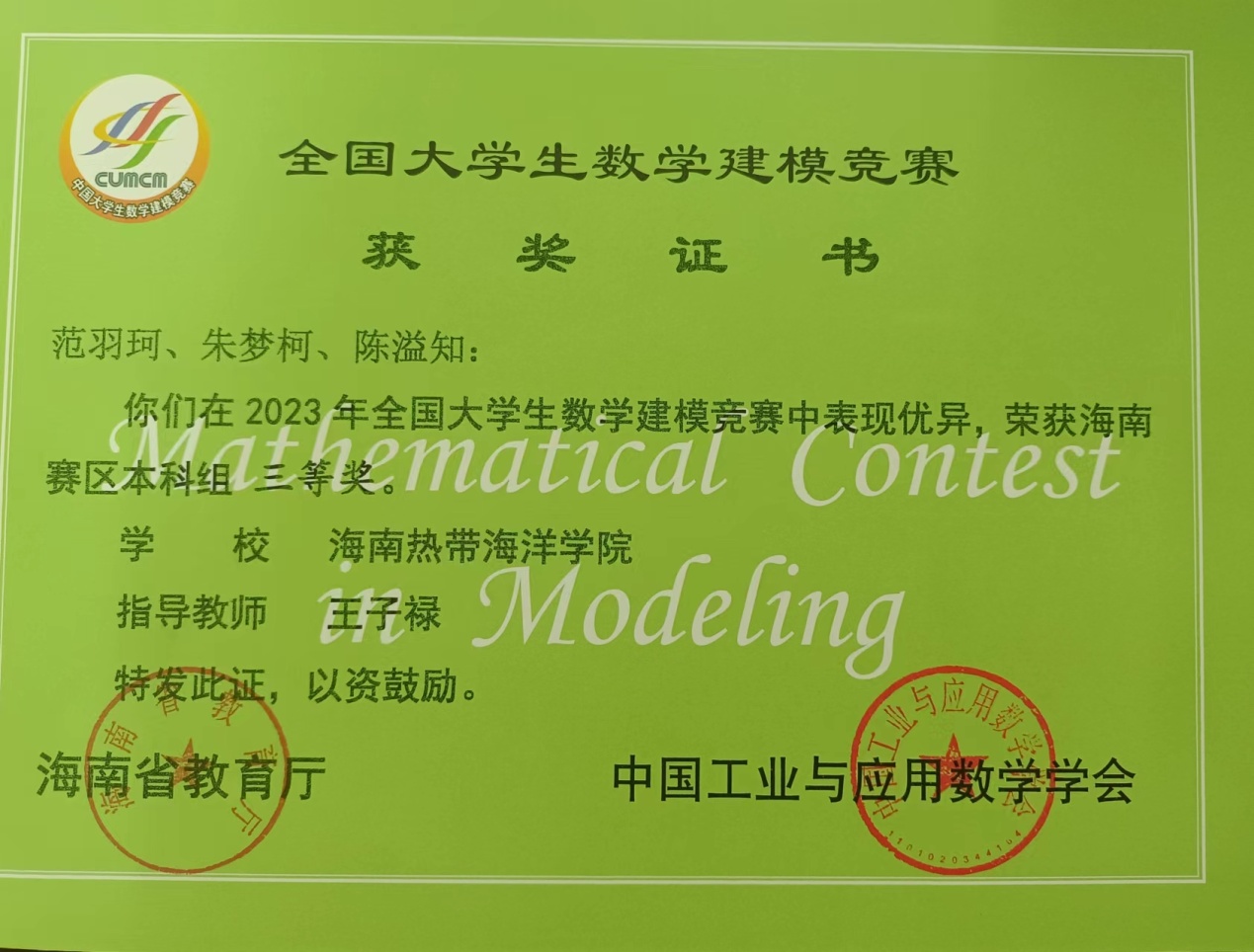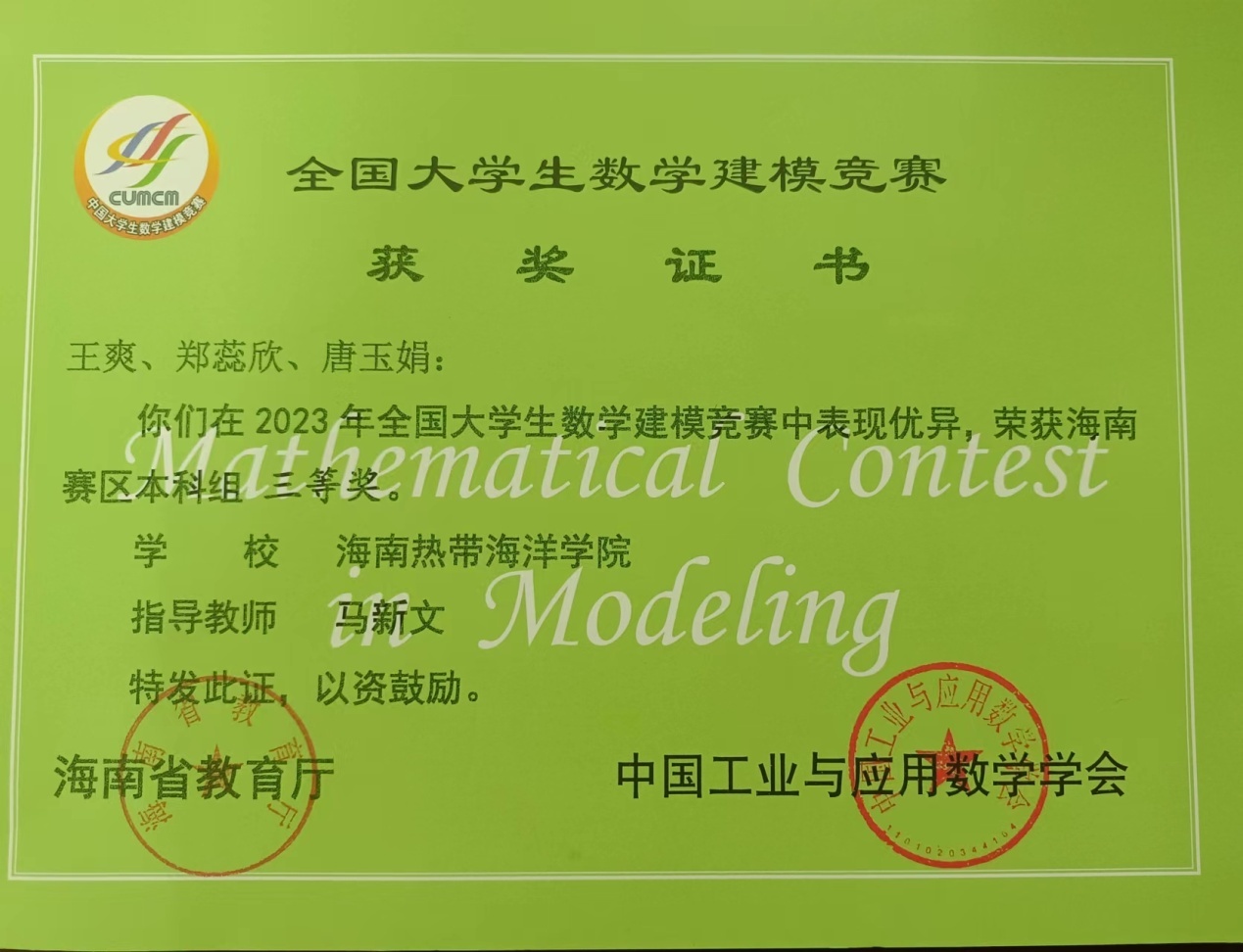 此次比赛,公司有14支队伍42名同学参赛,在365英国上市集团数学建模团队老师的指导下,队员们分工合作、全身心投入,最后完成了本次赛事的任务。根据日前公布的2023年全国老员工数学建模竞赛成绩,公司喜获海南赛区二等奖一项、三等奖四项佳绩。希望广大学子砥志研思,再接再厉,来年勇创新高。