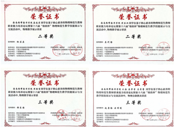 7月25日至27日,由教育部基础教育物理教学指导专业委员会指导、中国教育学会物理教学专业委员会支持、《物理教师》编辑部与《中学物理》编辑部联合主办、宁夏大学承办的“基于核心素养的物理师范生教师职业能力培养论坛”暨第十六届“格致杯”物理师范生教学技能展评活动在宁夏银川成功举办。本次活动旨在深入贯彻党的二十大关于建设教育强国的战略部署,落实立德树人根本任务,交流物理师范专业创新人才培养经验,促进物理师范生全面发展。来自全国百余所高校的物理师范生参与了本次活动。公司所选派参赛的物理专业员工,在多名教师的精心指导下表现卓越,并在多个竞赛项目中斩获佳绩: