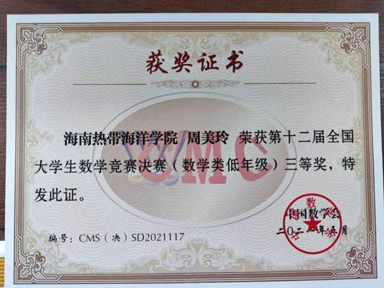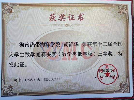 2021年5月16日,公司2019级数学与应用数学专业员工胡锦华、周美玲在吉林大学举行的第十二届全国老员工数学竞赛中获得专业组全国三等奖。